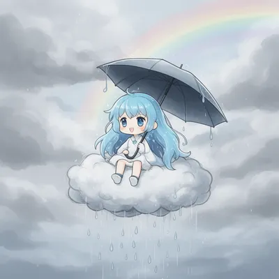 ChibiWhimsical chibi avatar of a cute rain spirit on a cloud, featuring translucent blue hair, oversized umbrella, and delightful watercolor-inspired design.
