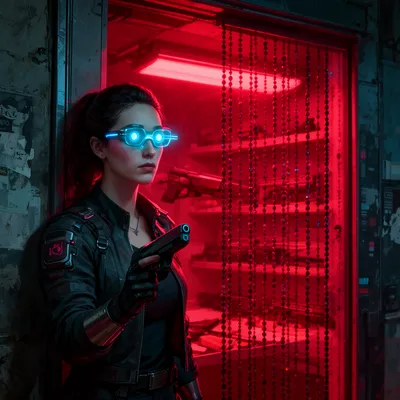 CyberpunkHigh-tech cyberpunk female avatar with weapon scanner eyes, street-level professional persona with a mysterious red-lit backstory and edgy urban aesthetic.