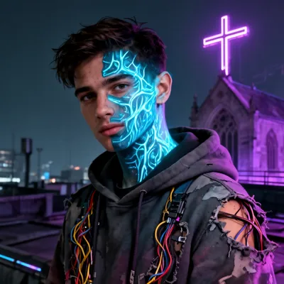 Immersive AI avatar featuring a young cyberpunk male with glowing bioluminescent tattoos, high-tech style, and futuristic urban aesthetic.