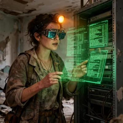 CyberpunkImmersive cyberpunk avatar of a tech explorer with vintage cybernetic glasses, dusty explorer attire, and green screen glow revealing digital archaeology aesthetic.