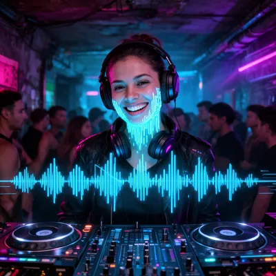 CyberpunkHigh-tech cyberpunk DJ avatar with sound-wave implants and electric blue visualizers, capturing futuristic digital art style in immersive underground club aesthetic.