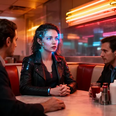 CyberpunkHigh-tech AI avatar of a shadowy identity broker with facial recognition scrambler implants, embodying a sleek and mysterious cyberpunk aesthetic.