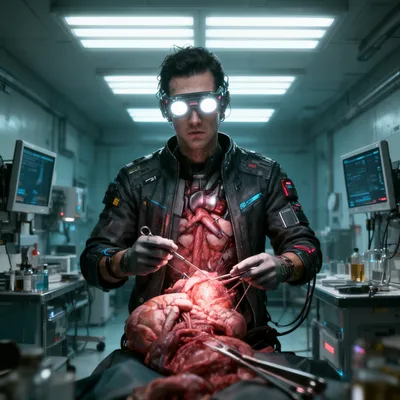 CyberpunkHaunting AI avatar depicting a clinical cyberpunk organ harvester with glowing medical scanning eyes, embodying cold surgical precision and technological detachment.