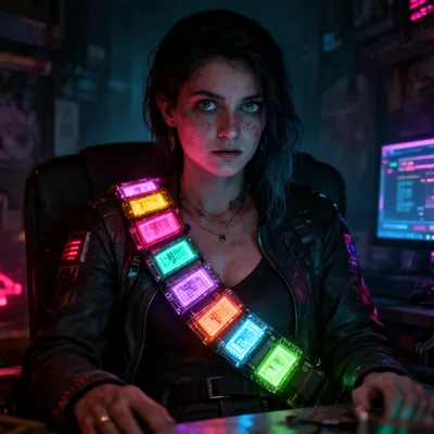 CyberpunkDark, haunting AI avatar of a cyberpunk memory dealer with glowing experience chips, revealing a complex technological narrative through intense visual design.