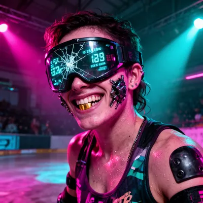 CyberpunkHigh-intensity cyberpunk avatar featuring a fierce roller derby competitor with tech implants, dynamic lighting, and a bold digital aesthetic perfect for sci-fi profile images.