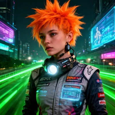 CyberpunkDynamic AI-generated avatar featuring a street-smart mercenary with vibrant orange spiky hair, holographic tech, and futuristic racer aesthetic in neon-charged urban landscape.