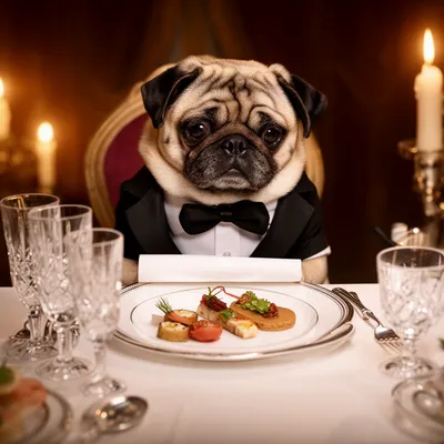 Charming AI-generated avatar featuring a sophisticated pug in a tiny tuxedo, seated at a candlelit dinner setting with gourmet flair and refined style.