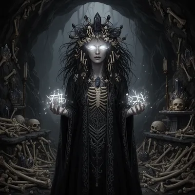 Dark GothicMystical dark gothic AI avatar with prophetic white eyes, bone-adorned hair, and ritualistic skeletal design revealing supernatural oracle aesthetic.