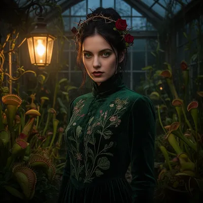 Dark GothicIntense gothic botanical AI avatar with deep green eyes, thorny rose hairpins, and dark velvet dress featuring intricate plant embroidery in moody conservatory setting.