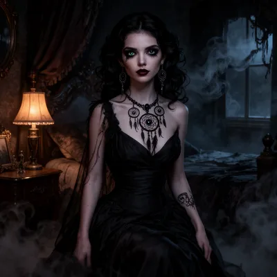 Dark GothicHaunting AI avatar with dark gothic elegance, featuring an alluring night hag persona in a stunning Victorian-inspired evening gown with dreamcatcher details.