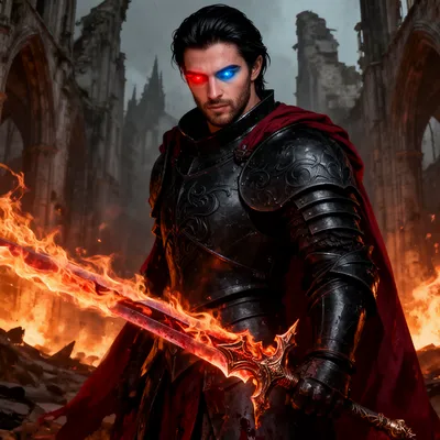 FantasyCinematic dark fantasy AI avatar featuring a powerful dark paladin with heterochromatic eyes, black plate armor, and a dramatic flaming greatsword background.
