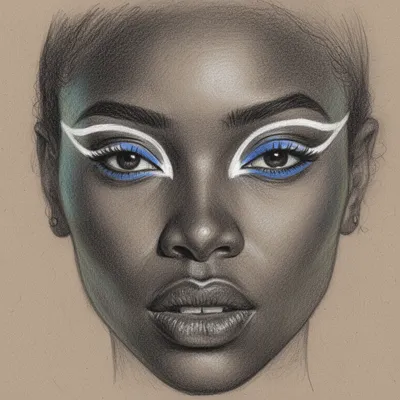 SketchMonochrome detailed colored pencil avatar of a woman with dark skin, white eyeliner, and strategic blue accents creating a striking artistic portrait profile picture.