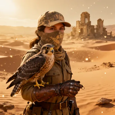 Stunning 3D render of a stoic female desert ranger with falcon, featuring intricate details and dramatic wasteland backdrop. Realistic survival-themed avatar.
