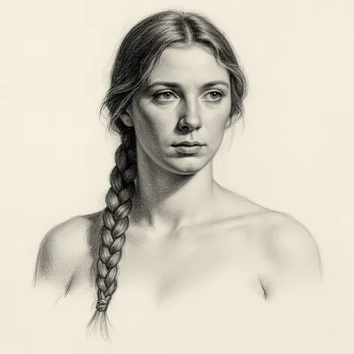 SketchArtistic AI-generated sketch avatar featuring a detailed pencil portrait of a woman with a sophisticated long braid, showcasing intricate shading and classical drawing techniques.