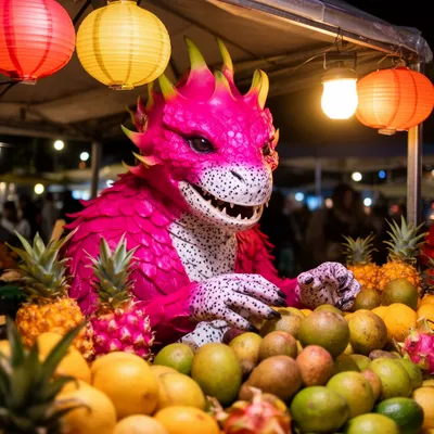 MonstersVibrant AI-generated avatar featuring a whimsical dragonfruit creature with hot pink scales arranging fruits at a magical night market stall under glowing lanterns.