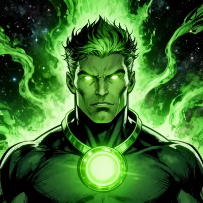 SuperheroesDynamic AI-generated superhero avatar with glowing emerald face, determined eyes, and powerful cosmic green energy background in bold comic book style.