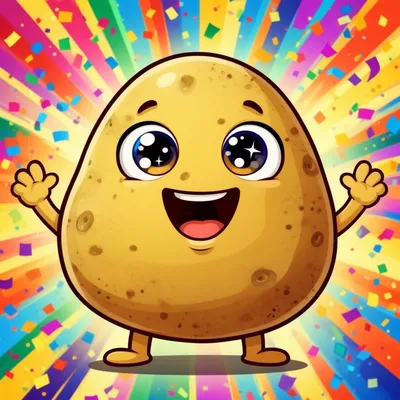 Vibrant cartoon avatar featuring a joyful yellow-brown potato monster with sparkling eyes, big grin, and energetic pose against a colorful confetti background.