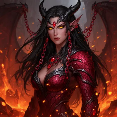 FantasyDark fantasy AI avatar featuring a powerful dragon priestess with obsidian hair, ruby chains, golden eyes, and crimson scaled armor in a mystical volcanic setting.