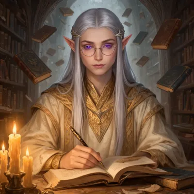 FantasyEthereal fantasy AI avatar featuring an ancient androgynous elf with silver hair, violet eyes, and scholarly robes, perfect for magical character representation.