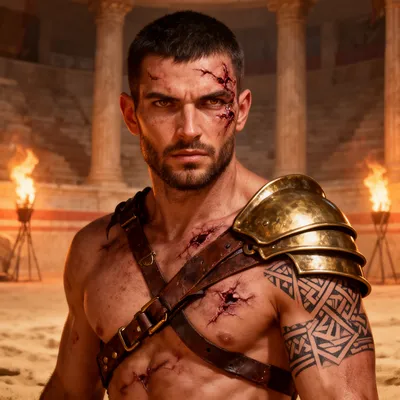 FantasyIntense human warrior avatar with combat tattoos and bronze armor, capturing the raw strength and dramatic lighting of epic fantasy gladiator art.