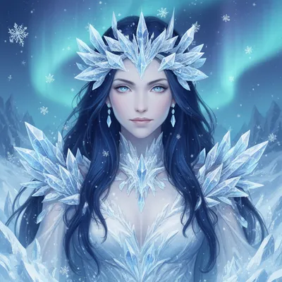 FantasyStunning AI-generated fantasy avatar featuring an elegant ice sorceress with deep blue hair, frost crystals, and mesmerizing pale blue eyes in a magical winter scene.