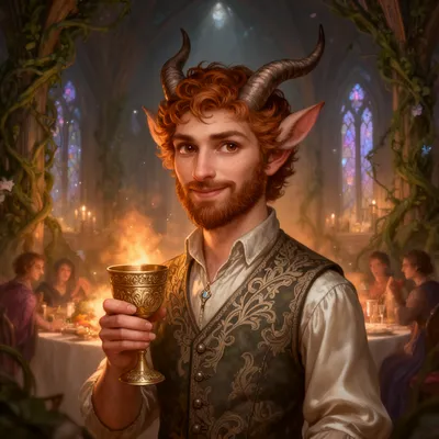 FantasyElegant fantasy AI avatar featuring a charming satyr diplomat with warm brown eyes, auburn curls, and regal fey-court style perfect for creative profiles.