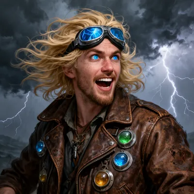 FantasyDynamic AI-generated fantasy avatar of a daring storm chaser with wild blonde hair, electric blue eyes, and dramatic thunderstorm lighting backdrop.