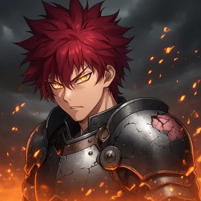 AnimeDynamic anime-style male avatar with fierce crimson hair, glowing amber eyes, battle-worn armor, and dramatic stormy background perfect for gaming and profile images.
