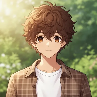 Charming anime-style male avatar with fluffy brown hair, warm chocolate eyes, and a gentle smile. Perfect for friendly profile representation.
