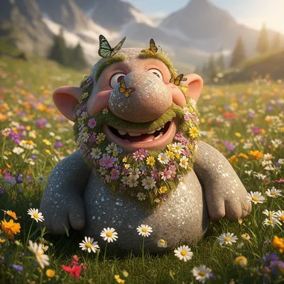 3D RenderCharming 3D render of a gentle mountain troll with a flower beard, sparkling granite skin, and playful butterflies in a sunny alpine meadow scene.