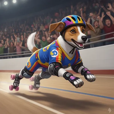 FurryDynamic anthro furry avatar featuring a spirited jack russell terrier in vibrant roller derby gear, capturing high-speed action and athletic spirit.