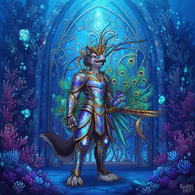 FurryVibrant anthro furry avatar featuring an iridescent peacock mantis shrimp in regal underwater armor, perfect for profile customization with marine-inspired design.