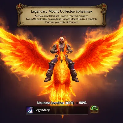 GamingImmersive gaming avatar featuring a rare phoenix mount collector with a 99% achievement, showcasing epic MMO character art with fiery mystical backdrop.