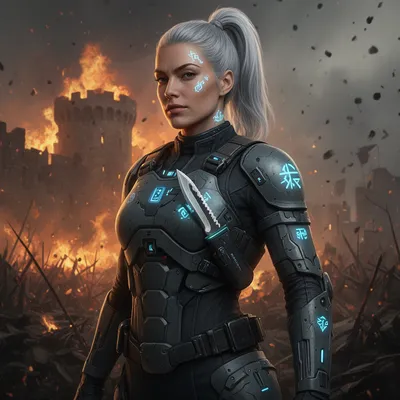 GamingHigh-tech female gaming avatar with silver ponytail, runic tattoos, and combat gear. Intense digital character design for pro gamer profiles and online personas.