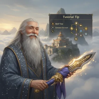 Epic AI-generated avatar featuring a wise RPG mentor with white beard, constellation robes, and mystical mountaintop background for gamers and character designers.