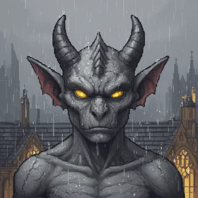 Pixel ArtDetailed pixel art avatar featuring a stone-skinned gargoyle with glowing yellow eyes, bat-like ears, and a gothic-inspired architectural design aesthetic.