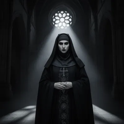 Dark GothicHaunting AI-generated avatar featuring a mysterious gothic nun with intense dark eyes, pale complexion, and intricate religious attire revealing subtle mystical details.