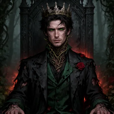 Dark GothicHaunting AI avatar of a tragically handsome gothic prince with emerald eyes, thorny vine corruption, and royal dark aesthetic perfect for mysterious character designs.