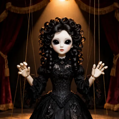 Dark GothicHaunting AI-generated gothic avatar featuring a porcelain-like Victorian puppet master with mesmerizing dark eyes and intricate ringlets against dramatic stage lighting.