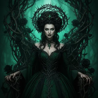 Dark GothicHaunting gothic AI avatar featuring a fierce dark queen with deep green eyes, thorny crown, and royal dark aesthetic capturing supernatural beauty.
