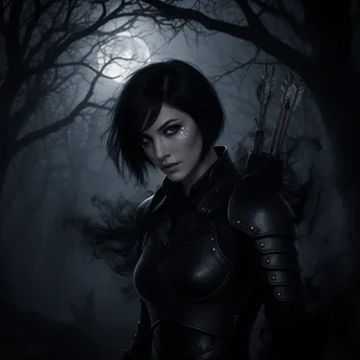 Dark GothicMysterious AI avatar featuring a lean dark gothic archer with silver-flecked eyes, dark leather armor, and ethereal shadow enchantments in a moonlit forest setting.