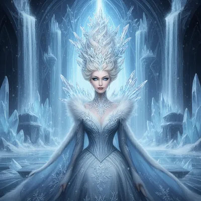 Ethereal dark gothic AI avatar featuring a frost-inspired snow queen with crystalline blue eyes, intricate ice hair, and an elegant frozen royal aesthetic.