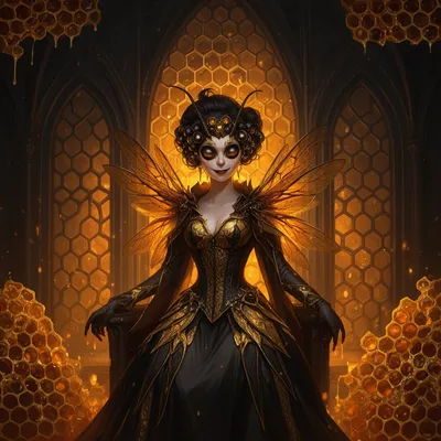 Dark GothicEthereal AI avatar featuring a regal gothic vampire bee queen with intricate honeycomb details, dark amber eyes, and dramatic wing-inspired costume design.