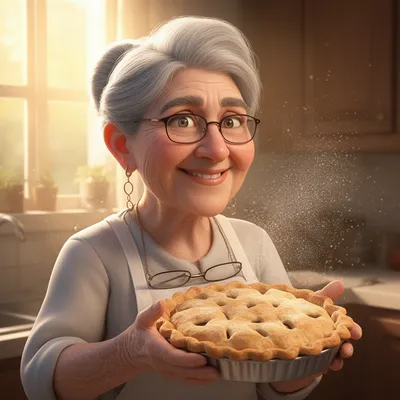 3D RenderNostalgic 3D render avatar of a sweet silver-haired grandmother in soft kitchen lighting, capturing warmth and traditional baking charm with detailed facial features.