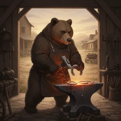 FurryDynamic furry avatar featuring a muscular bear blacksmith in leather apron, crafting horseshoes at a rustic frontier forge with dramatic sparks and workshop backdrop.