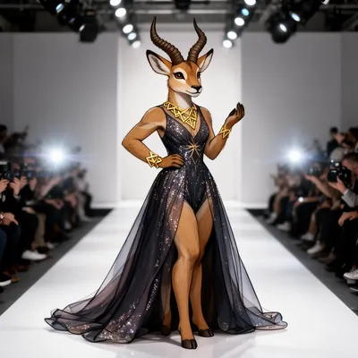 FurryChic anthropomorphic gazelle avatar in haute couture gown, featuring stylish geometric gold jewelry and runway-inspired design for furry art enthusiasts.