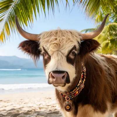 PetsUnique AI-generated avatar featuring a majestic Highland cow calf with striking cream and chocolate points, adorned with a bohemian beaded necklace and regal feline-inspired beauty.