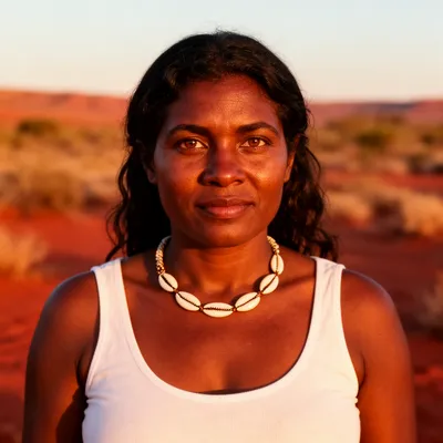 Authentic AI-generated profile avatar of a young Indigenous Australian woman in golden desert light, featuring a serene cultural portrait with natural beauty and depth.