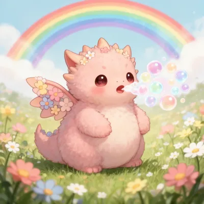 KawaiiAdorable fluffy baby dragon AI avatar with flower petal wings, pastel bubbles, and magical meadow background perfect for playful digital profiles.