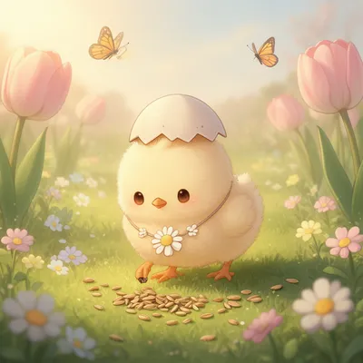 Adorable kawaii-style AI avatar featuring a fluffy yellow chick with an eggshell hat, nestled in a vibrant spring garden with soft morning light and delicate details.